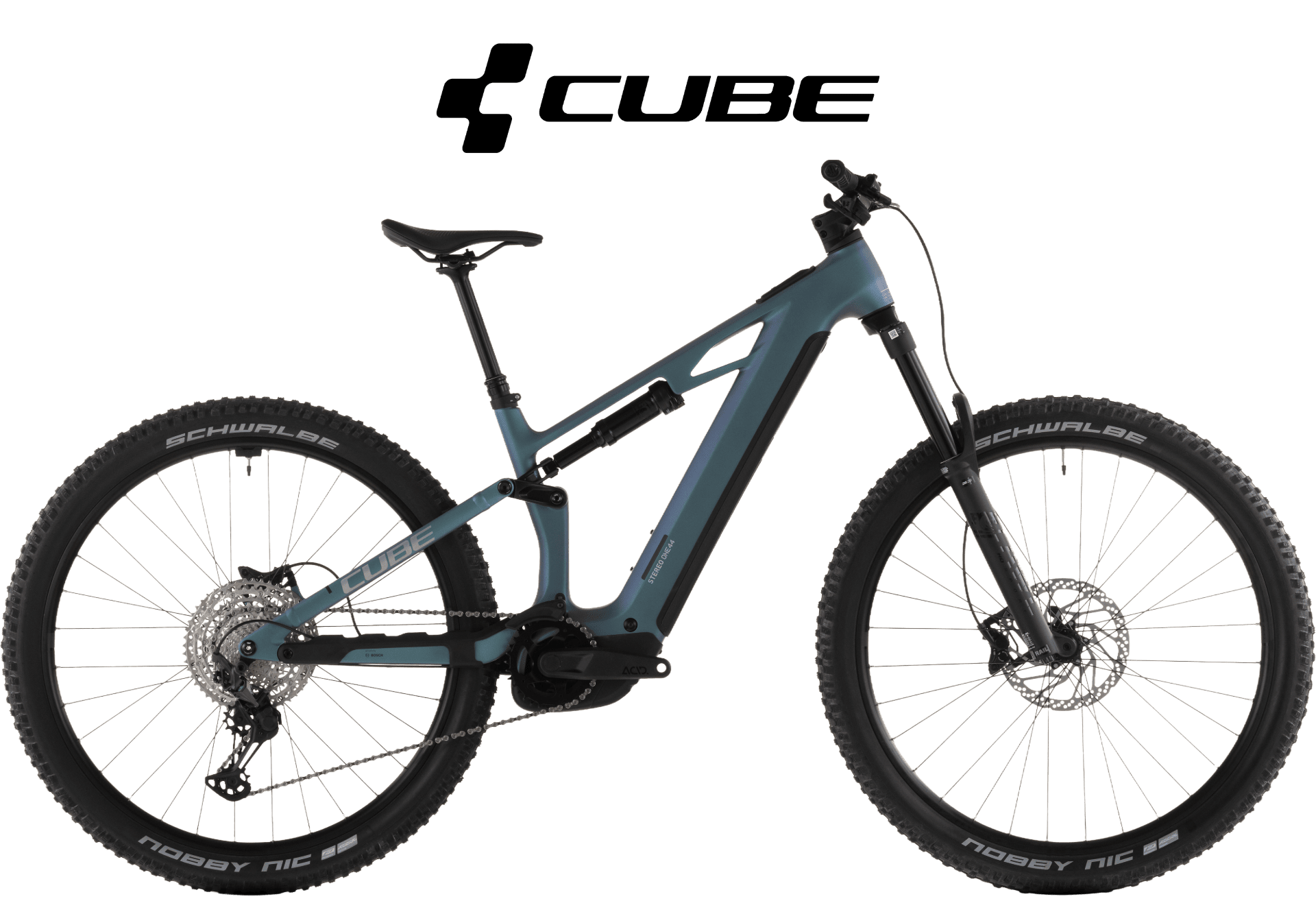 Vélo électrique type VTT tout suspendu All-Mountain pour une utilisation sur chemins de fôret légèrement accidentés.